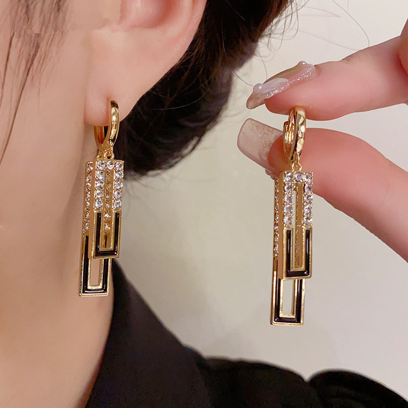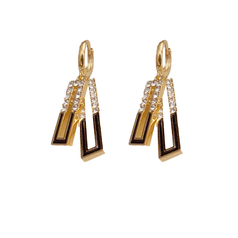 这是一款轻奢风格的几何镶钻耳环,采用金色金属材质,主体是黑白(红白)撞色的几何造型,边缘镶嵌细密水钻,搭配简约耳扣,风格兼具复古与现代感。日常通勤、约会、轻商务场合都能佩戴,可搭配简约服饰提升精致感,也能和同风格项链、戒指组成套装。